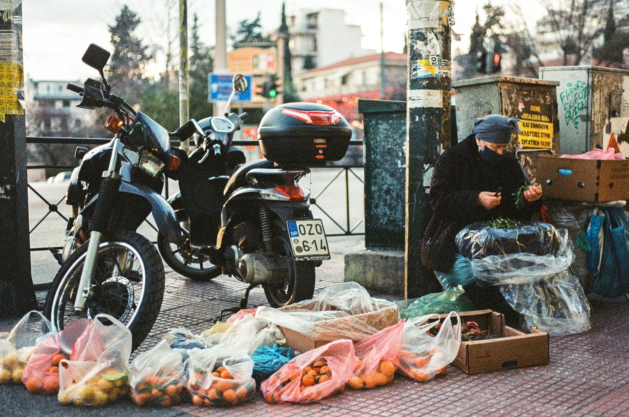 A street scene showing a woman selling fresh produce, including potatoes and herbs, on the sidewalk next to two parked motorcycles. The woman is sitting on a plastic-covered container, wearing a headscarf and face mask.